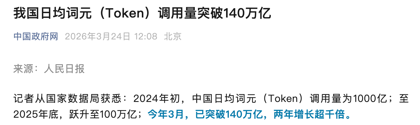 国家数据局最近悄悄放出了一个数据:2024年初,中国每天的Token调用量是1000亿;到了今年(2026年)3月,这个数字直接飙到了140万亿。两年时间,翻了一千倍。