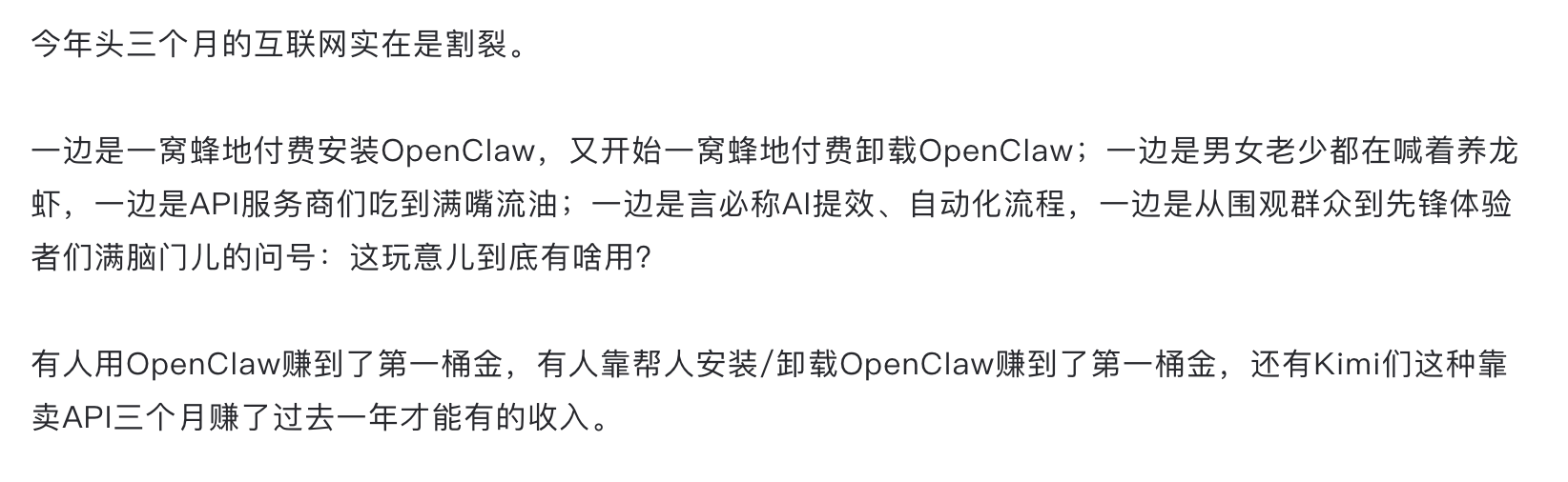 任何一次技术大爆炸,第一波赚到钱的永远不是造火箭的,而是卖铲子的。面对 OpenClaw 这种级别的生产力核武,旧有的商业秩序正在被迅速撕裂,巨大的套利空间直接砸在了普通人脸上。